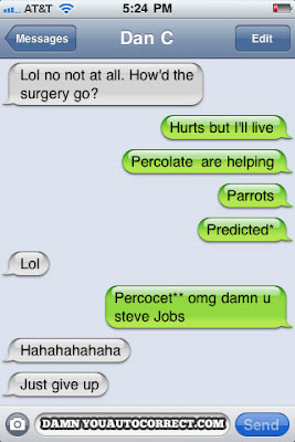 Had a horrible headache yesterday. HORRIBLE. Of course, it didn't help that my friend Mik sent me a link to www.damnyouautocorrect.com. You know those pesky iPhones, you're innocently texting and you type in a word like "today" and the Autocorrect function defaults it to a word like FLAGELLATE, or something crazy. I've had some good ones. But this site has them all. Especially this little gem: